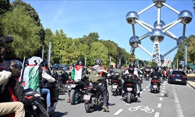 Qindra motoçiklistë u mblodhën dhe formuan një kolonë në Atomium, monumentin ikonik të Brukselit, për të demonstruar në mbështetje të Palestinës.